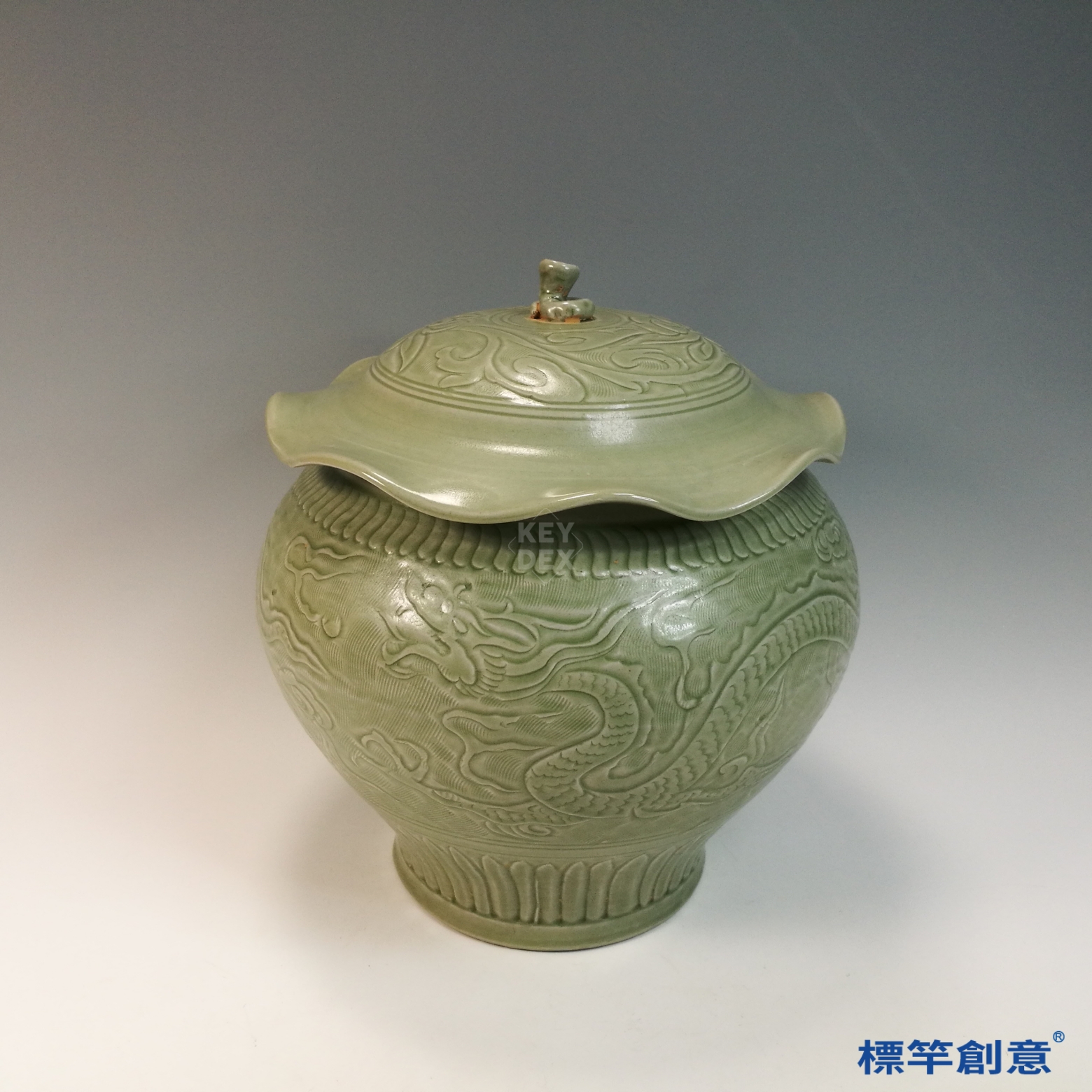 FC082 五代越窯青瓷剔刻龍紋荷葉蓋罐