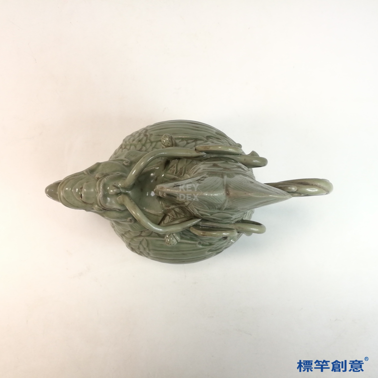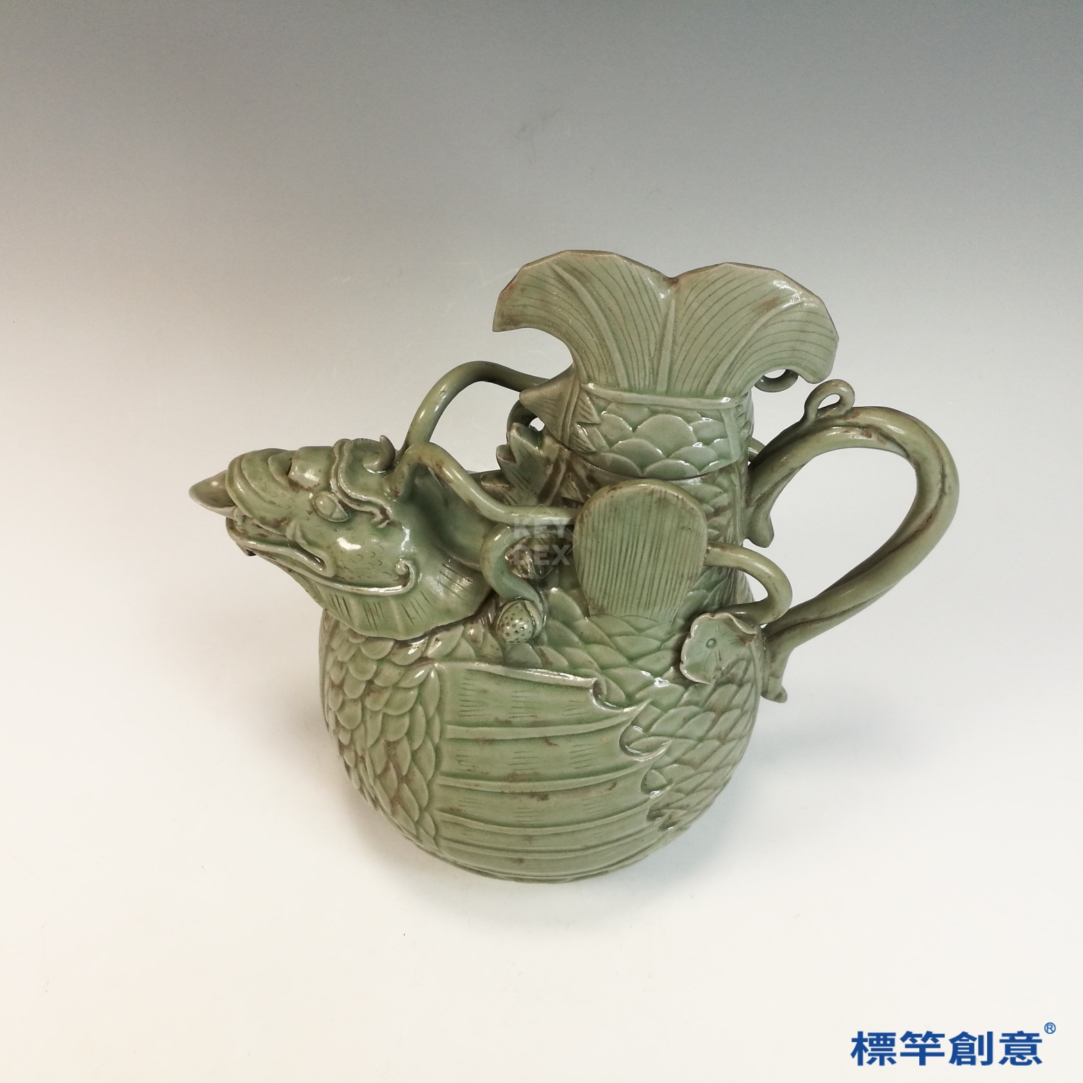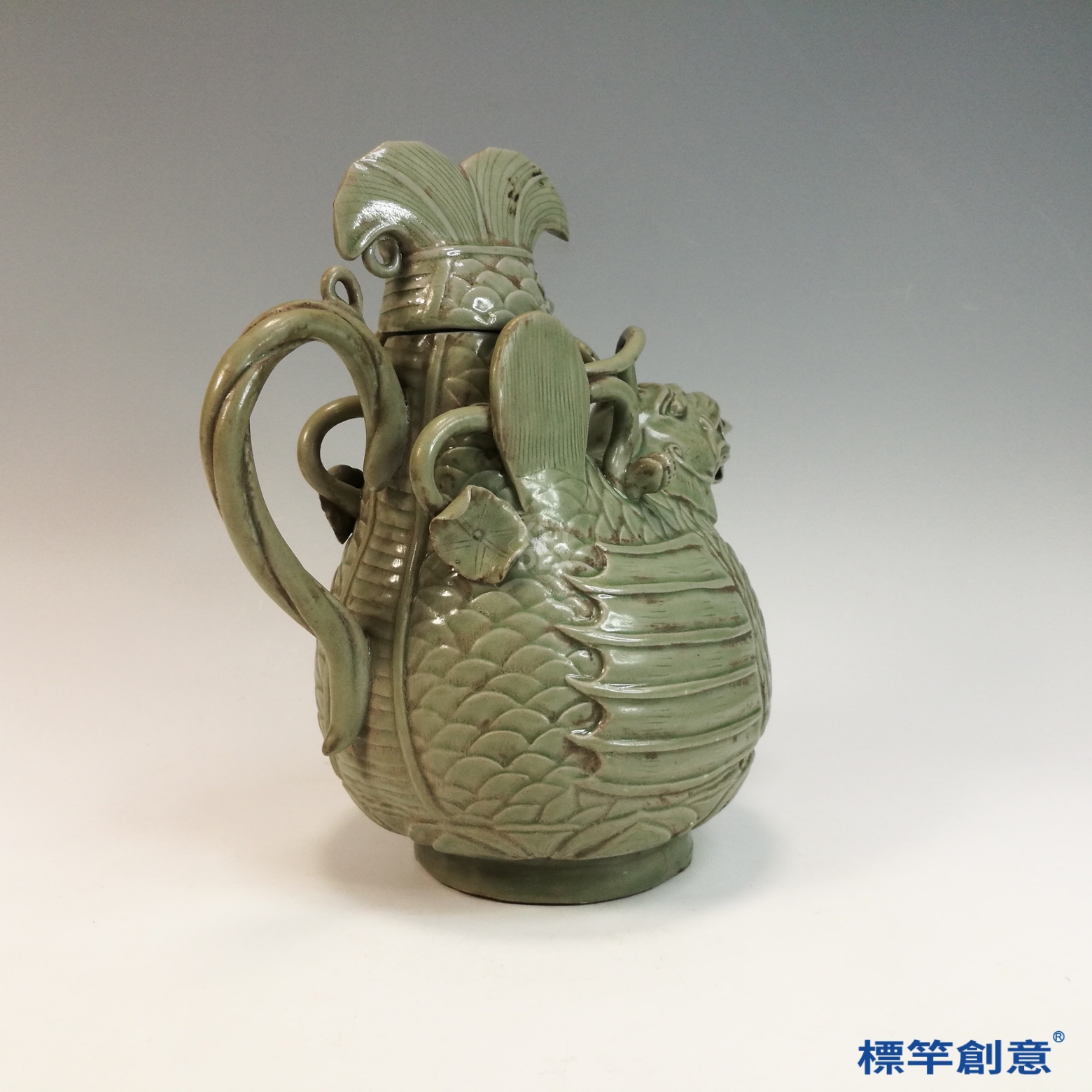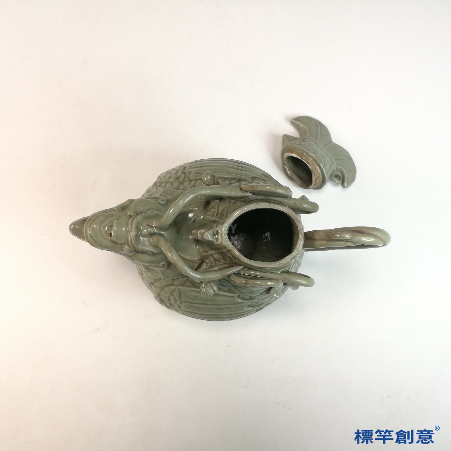 EG008 南北朝臨水窯青瓷刻蓮紋雙雞首龍把壺