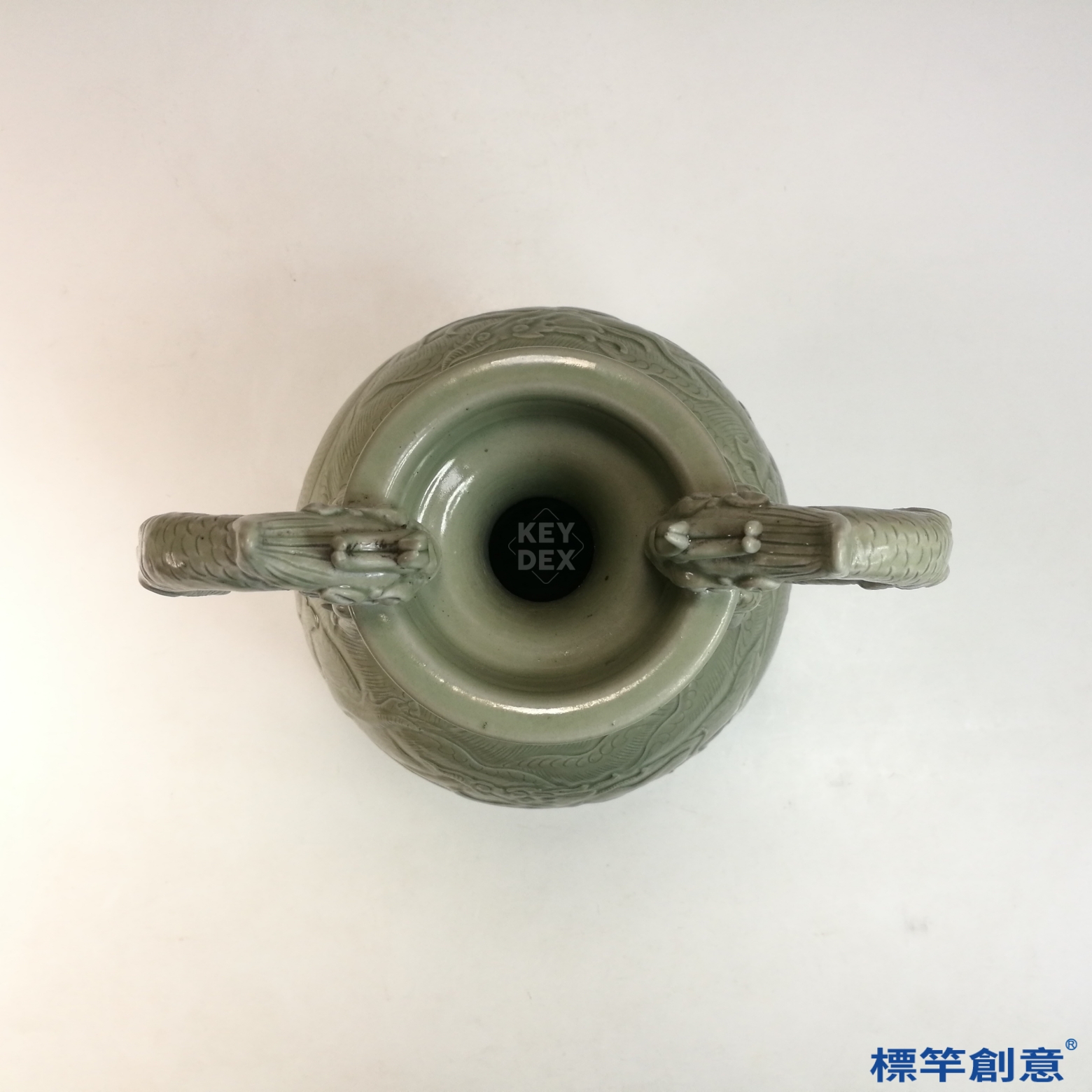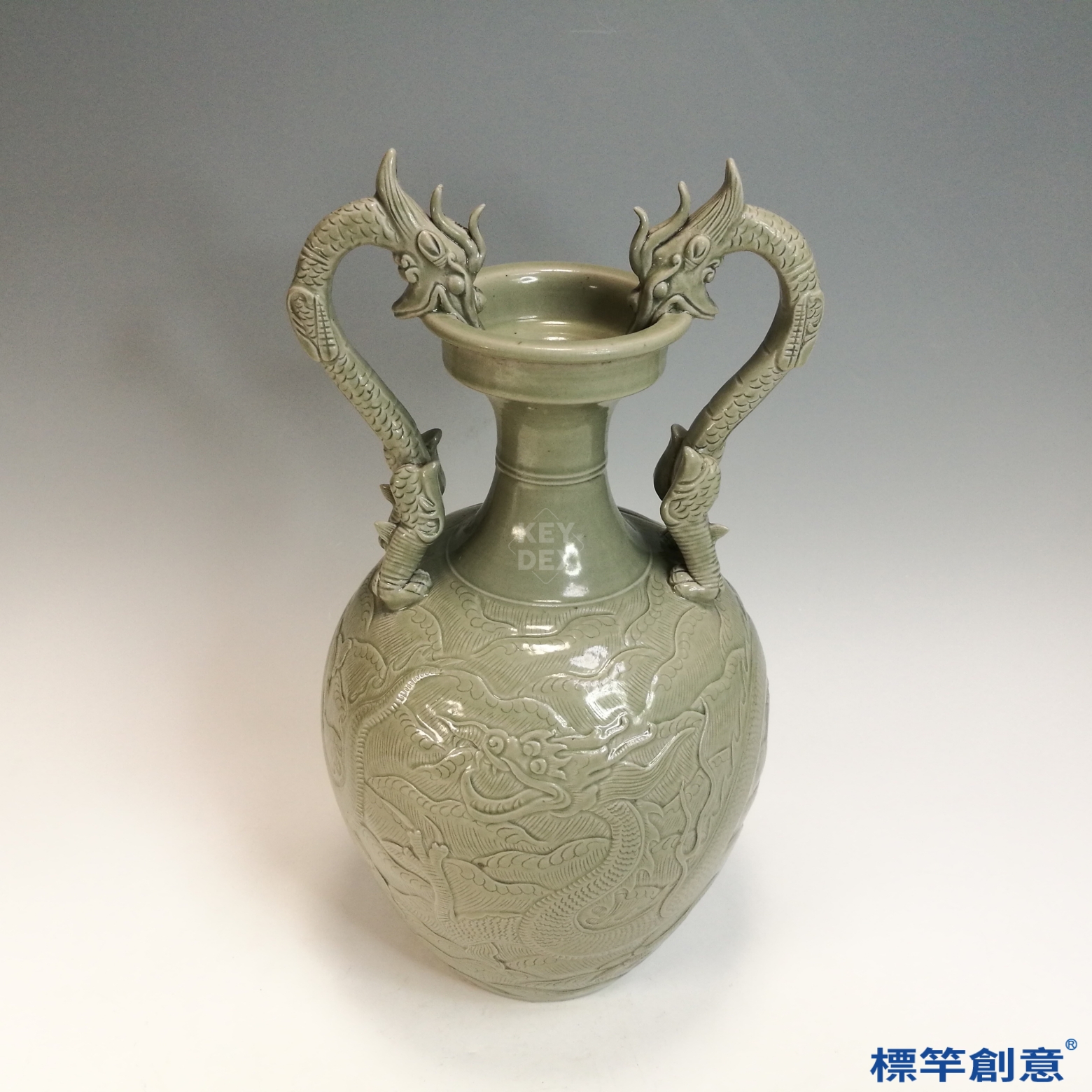 FC098 五代越窯青瓷刻出水龍紋雙龍耳瓶