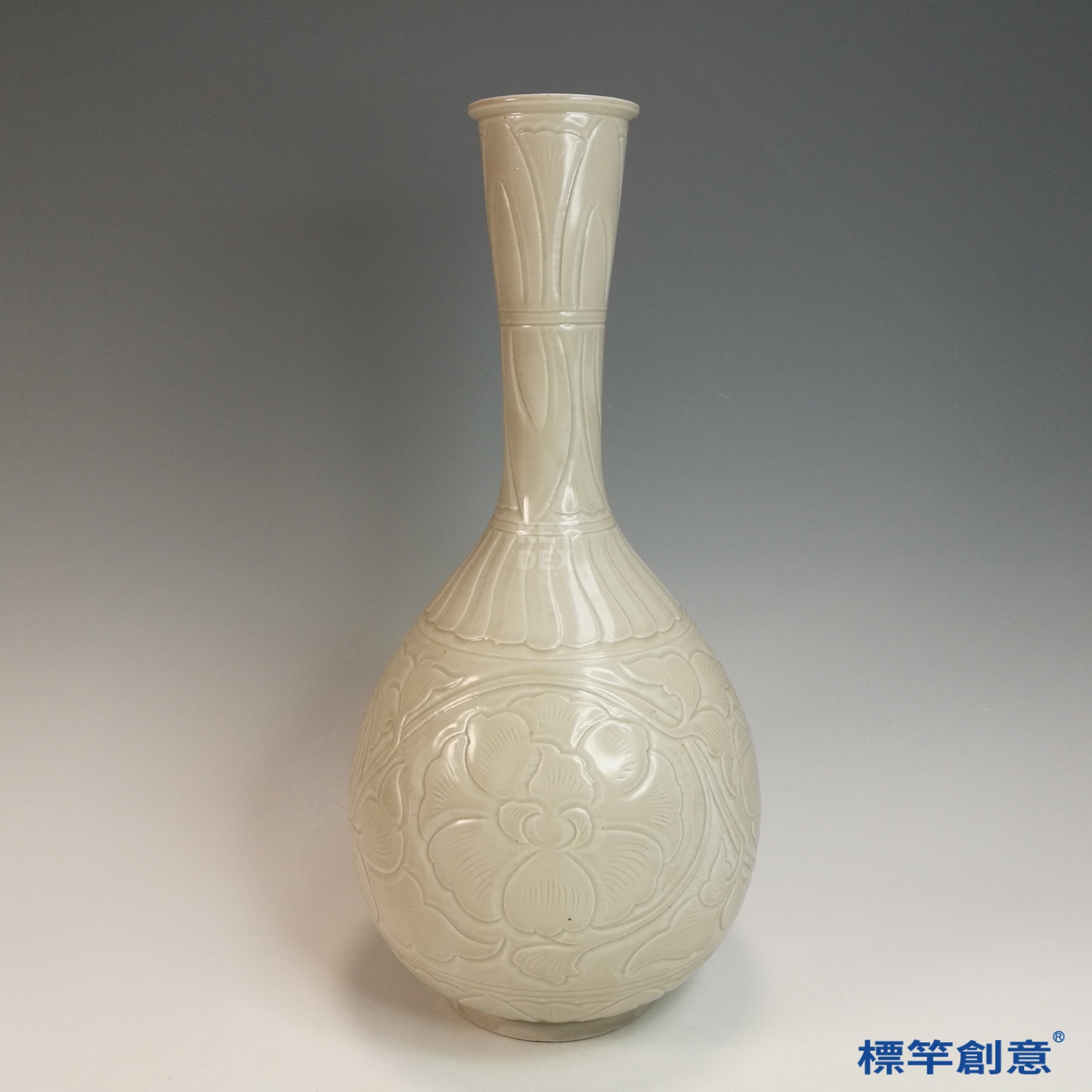 GB204 北宋定窯白釉刻折枝牡丹紋供官長頸瓶