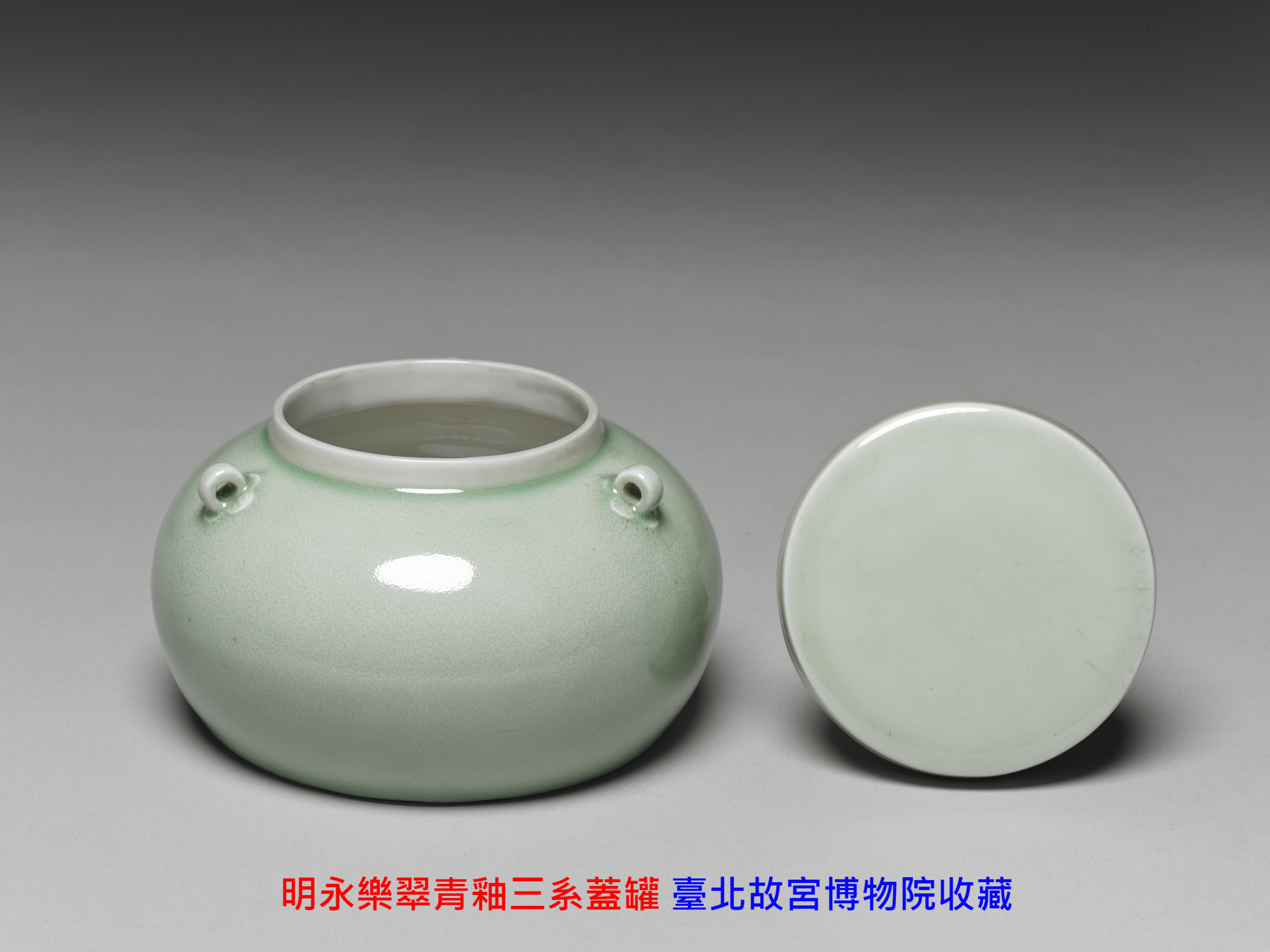 通體施翠青釉,釉質肥潤晶瑩,寶光四射,色澤均勻且不泛雜色,屬於明代高品質青釉之一。罐身三繫設計簡練實用,造型古雅。