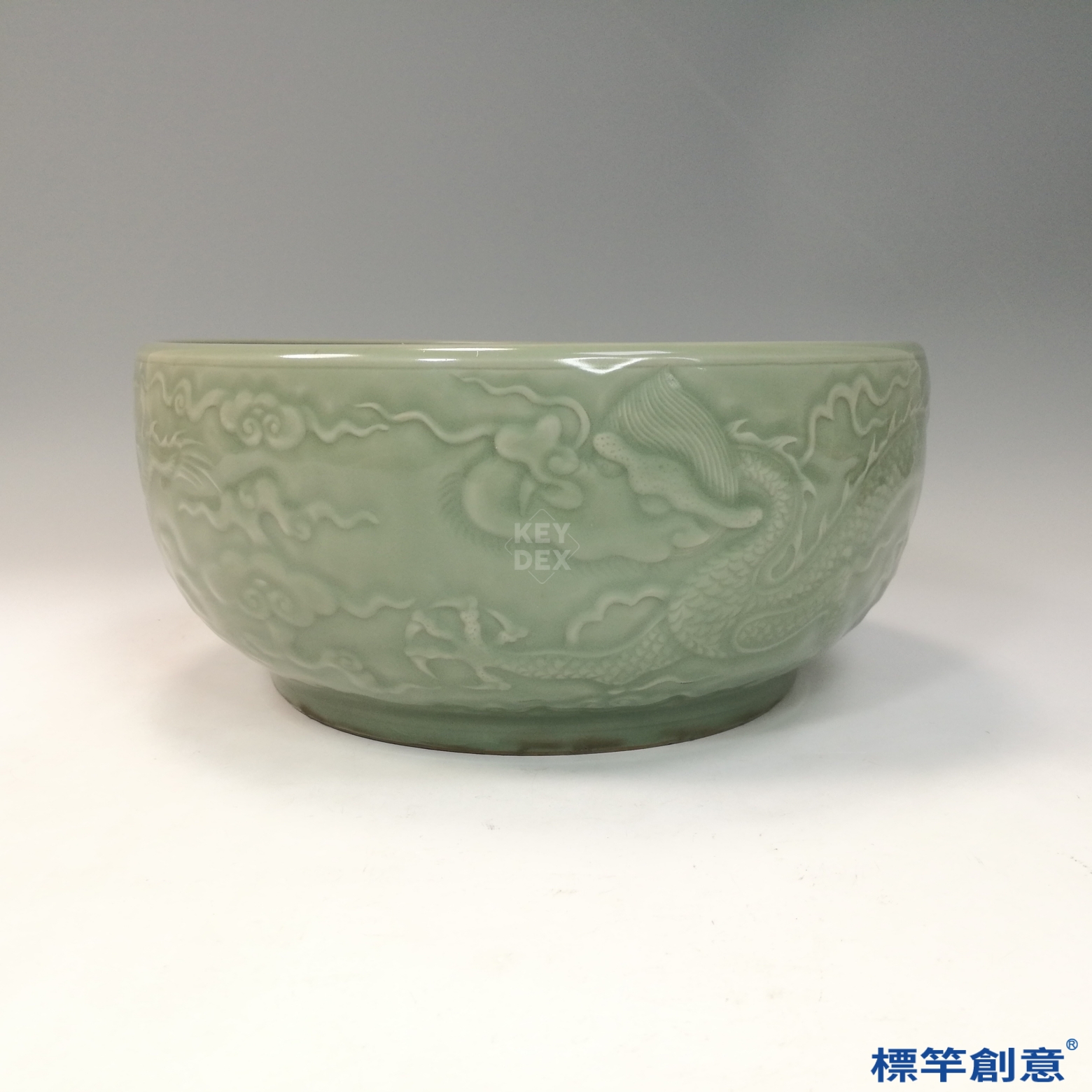 通體施粉青釉,色澤清潤,質感柔和,具有「積粉凝翠」之美。盆腹以淺浮雕技法刻畫五爪蟠龍紋,神態矯健、氣勢非凡。其紋飾布局講究,呈典型皇室尊貴象徵。胎體細膩堅緻,刻紋轉折清晰,工藝成熟。