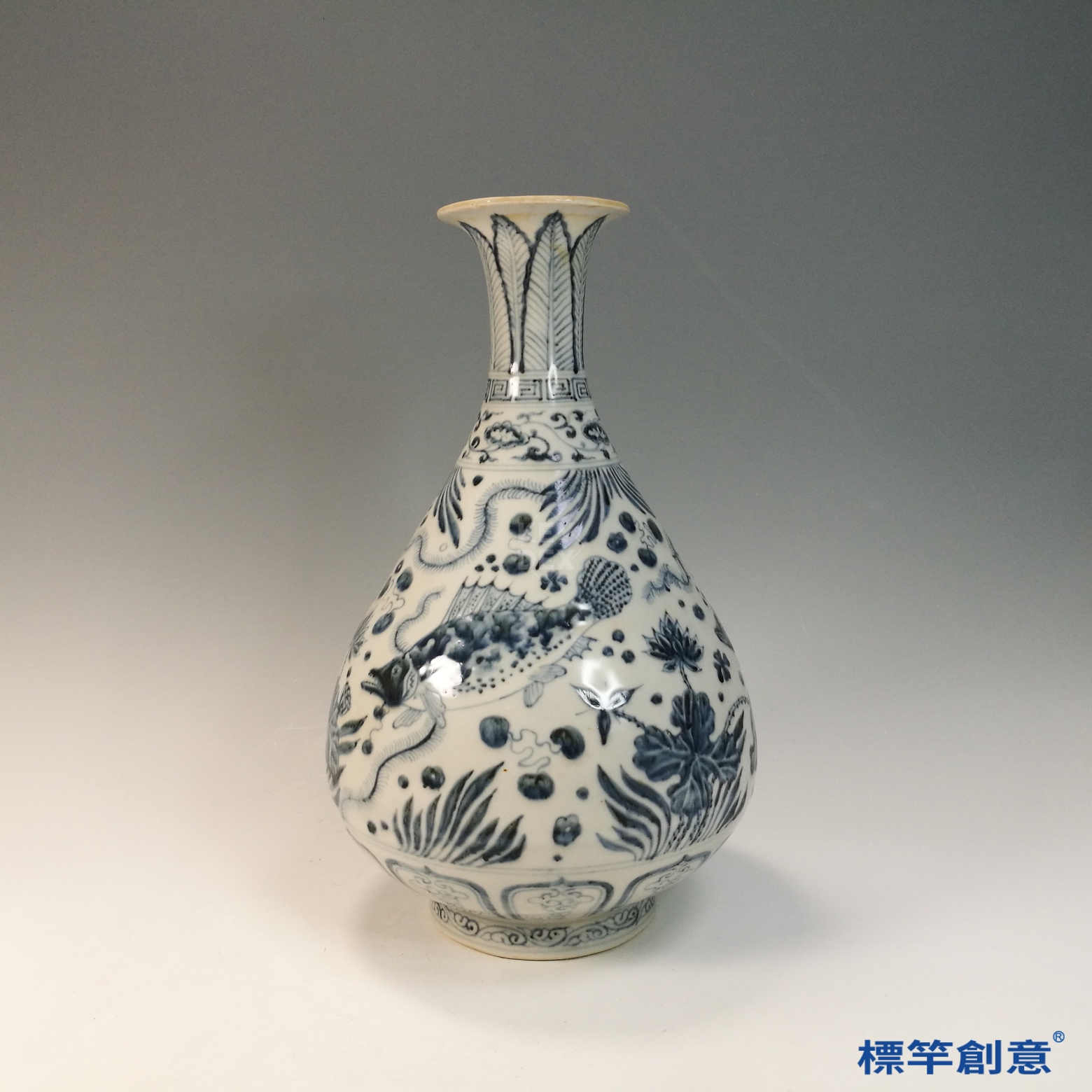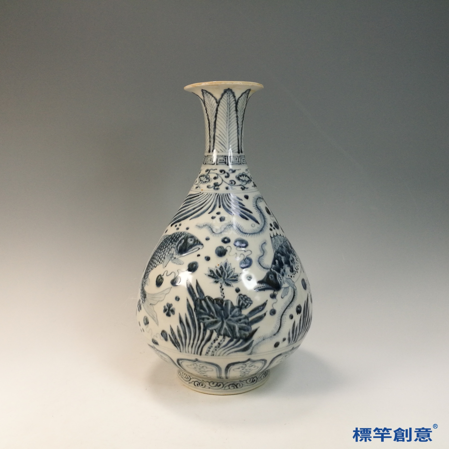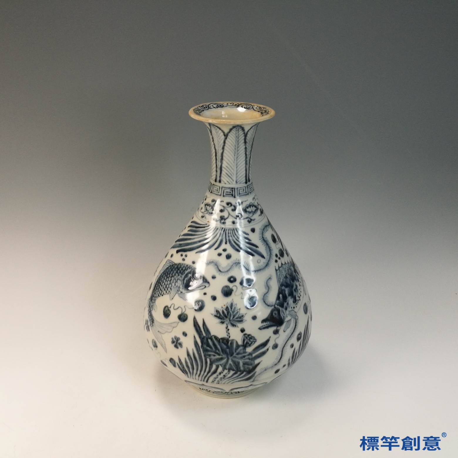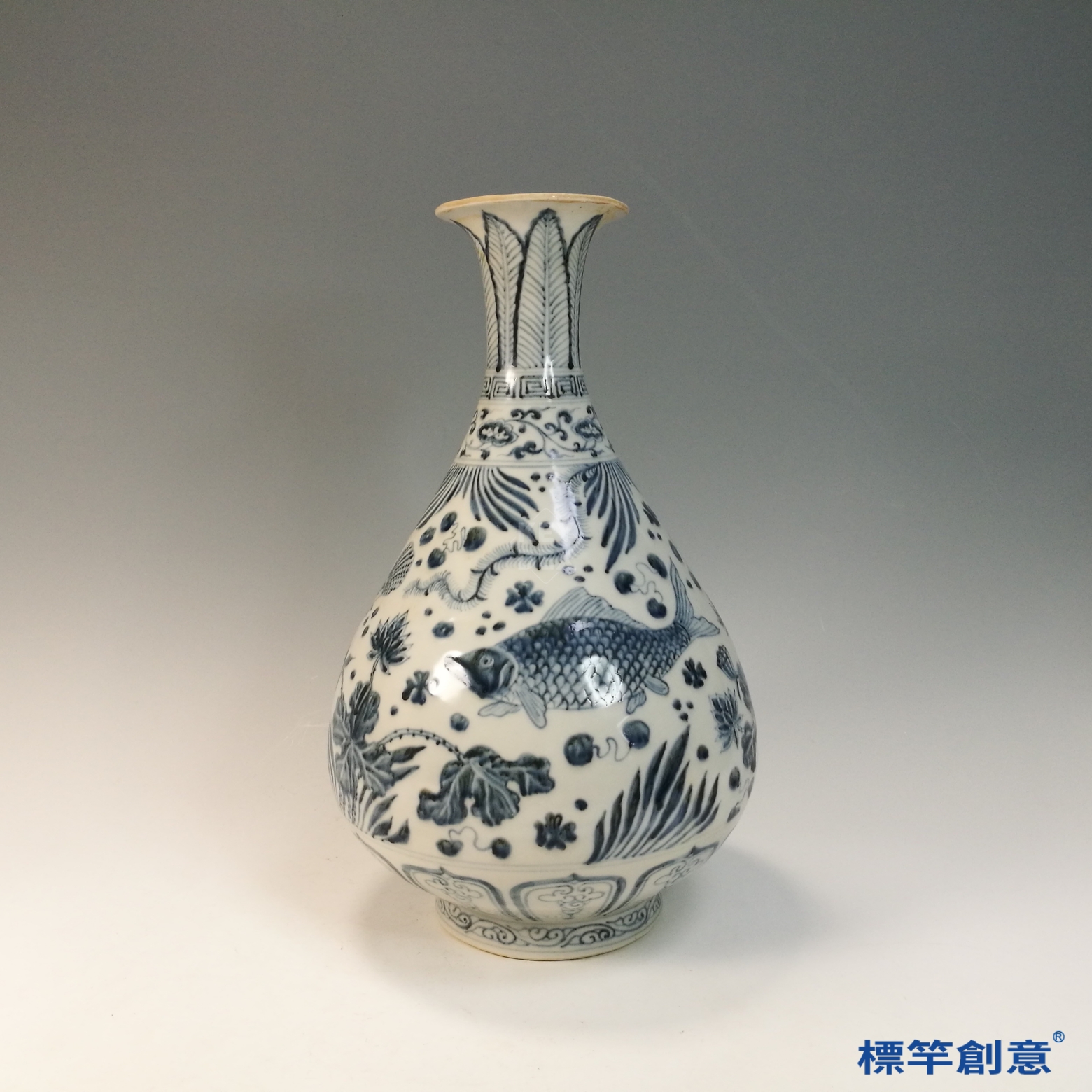玉壺春瓶在明初常見於宮廷陳設、佛前供器與皇室饋贈等用途。其所繪魚藻紋寓意「年年有餘」、「蓄養萬物」,具有吉祥與繁榮之象徵,適用於祝壽、賀禮與宗教祭儀。
