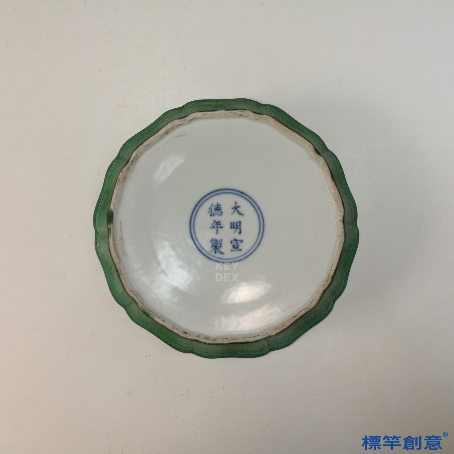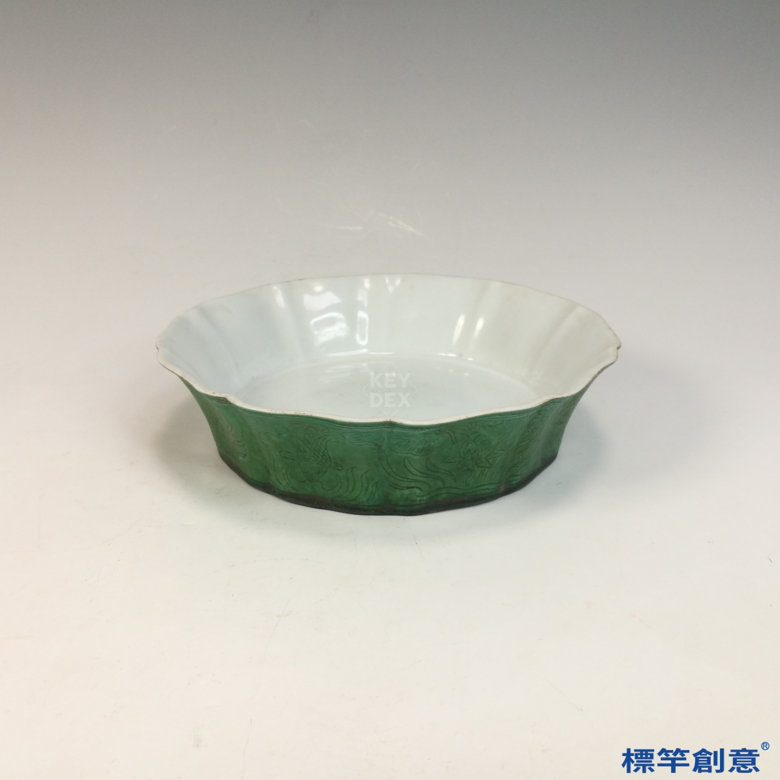 HB156 明嘉靖瓜皮綠釉刻魚藻紋宣德款菱口筆洗