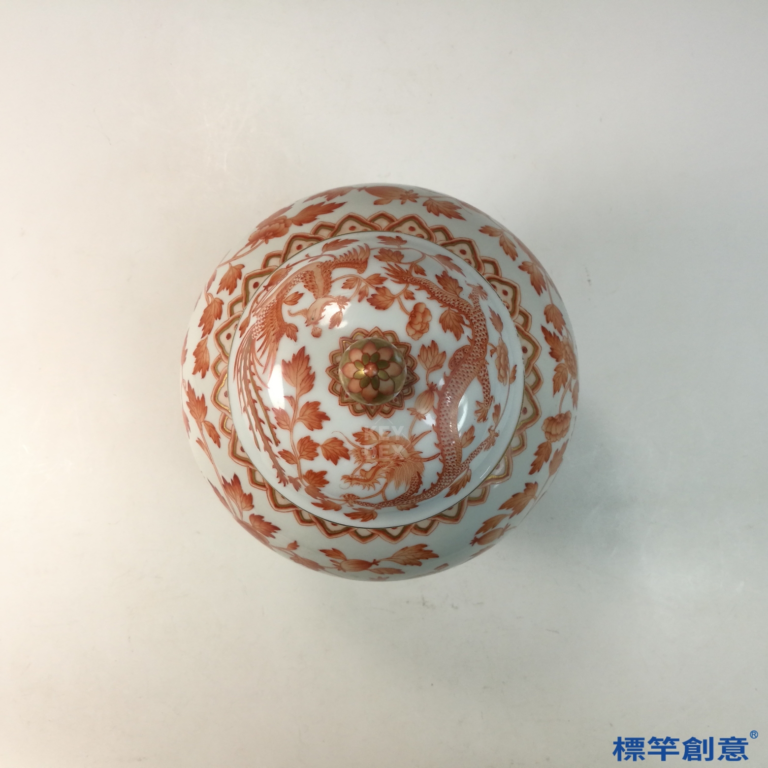 通體施礬紅釉,釉色沉穩典麗,局部以金彩描繪五爪金龍與鳳凰騰飛於火焰雲氣之間,構圖對稱、紋線清晰,描金細膩厚實,反映高超官窯技藝。蓋身相應裝飾,整體莊嚴華美。