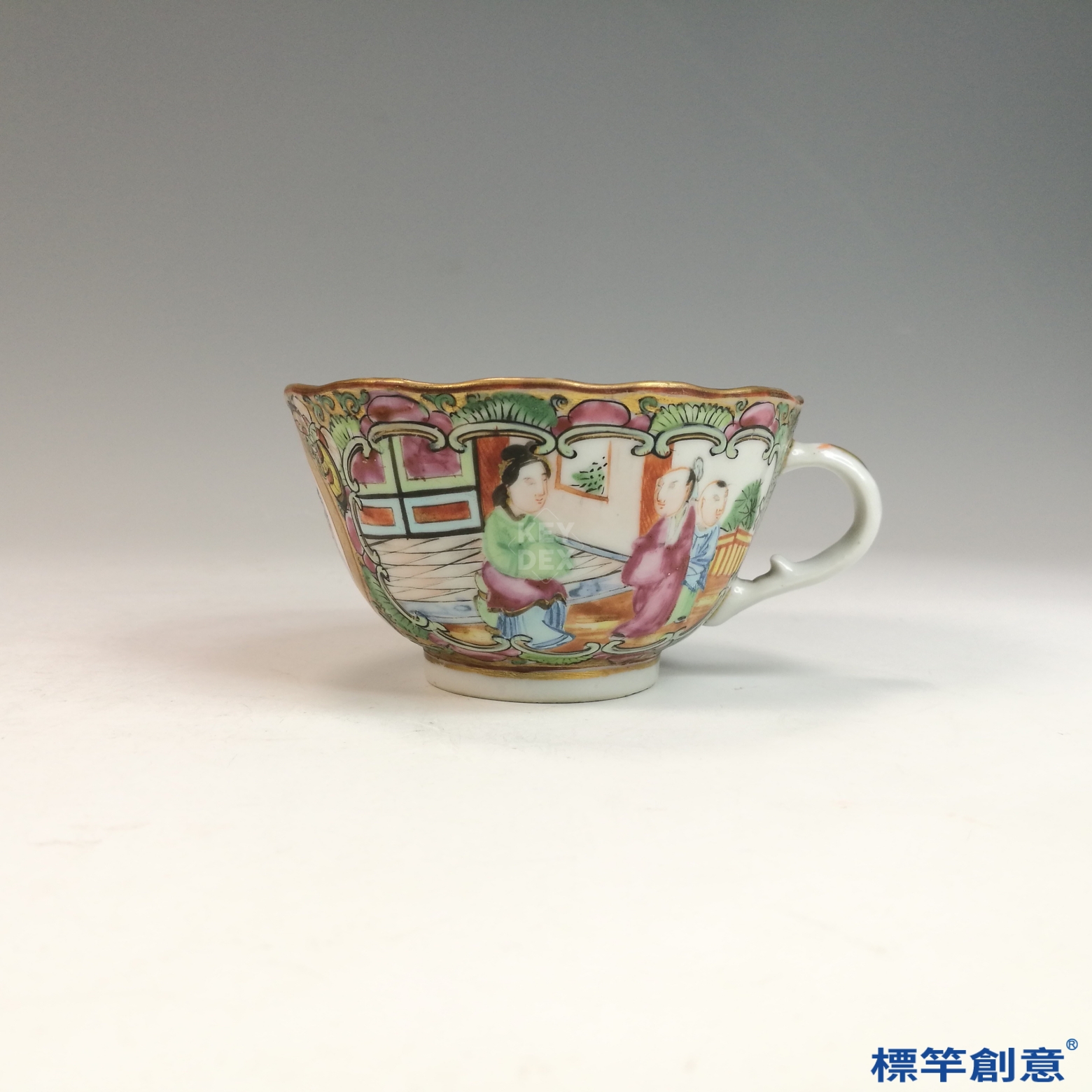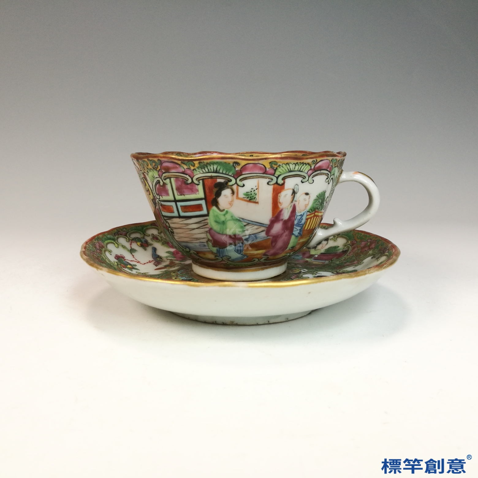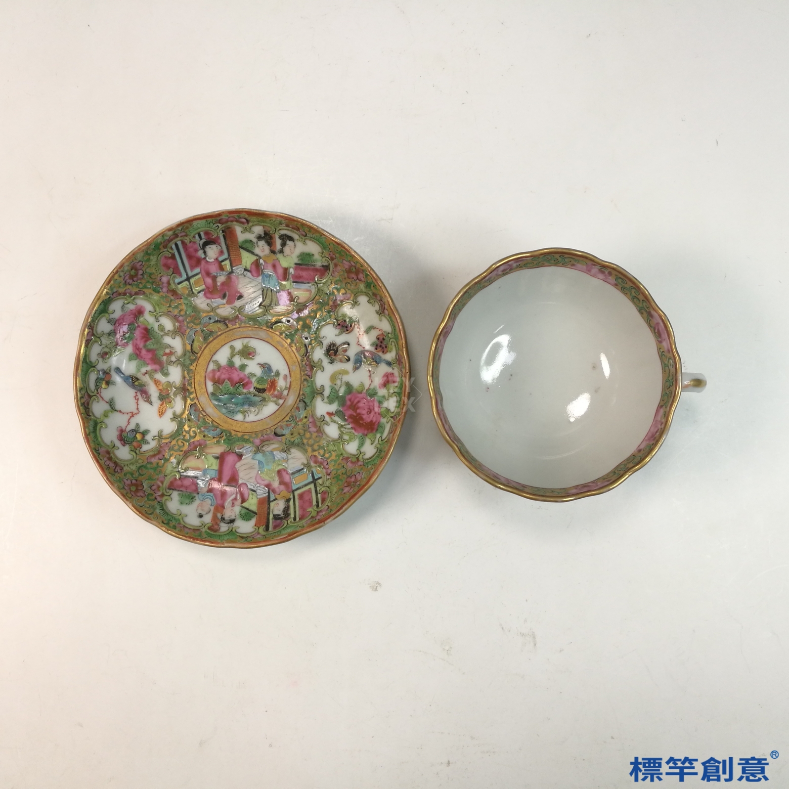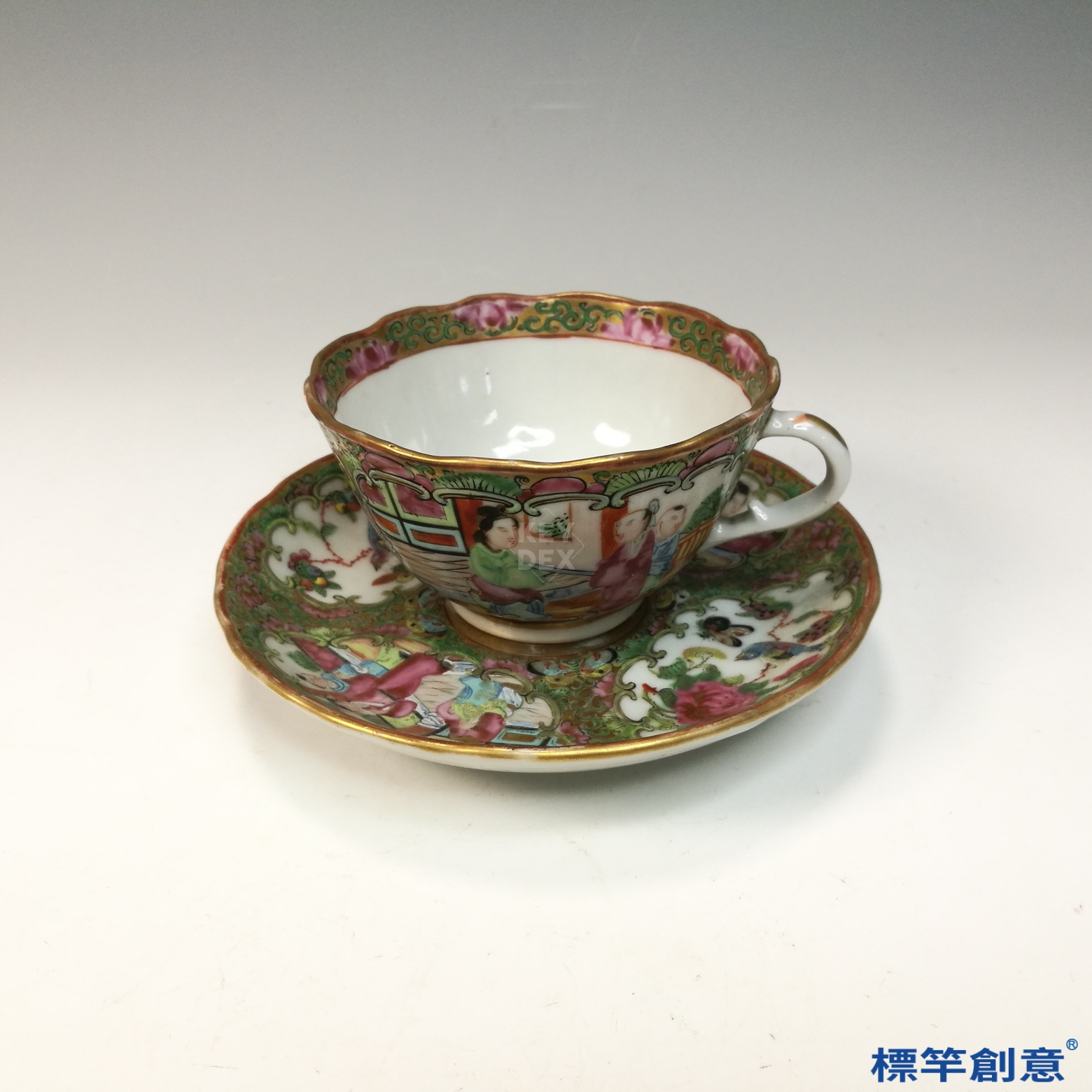 IA071 清同治廣彩描金人物故事咖啡杯托盤一組