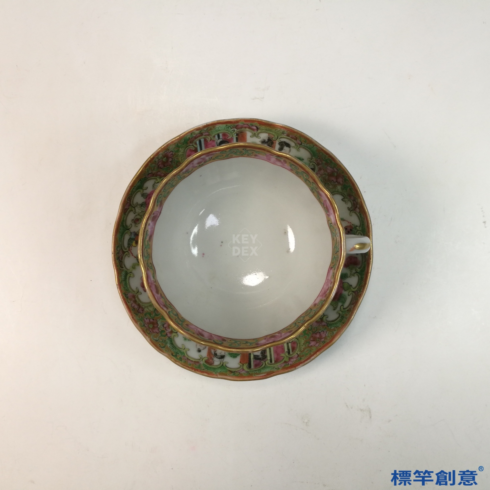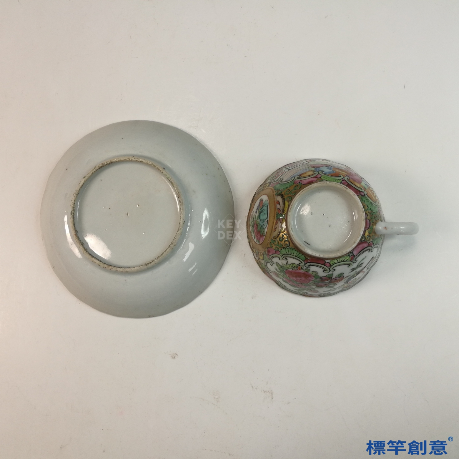 杯與托盤表面均以濃艷廣彩繪製人物故事圖,人物動作生動、衣飾繁麗,背景綠樹、建築交織,畫面構圖繁密。器物邊緣施描金裝飾,華麗典雅,具典型晚清外銷瓷風格。瓷胎細白,施釉勻淨,畫工嫻熟。