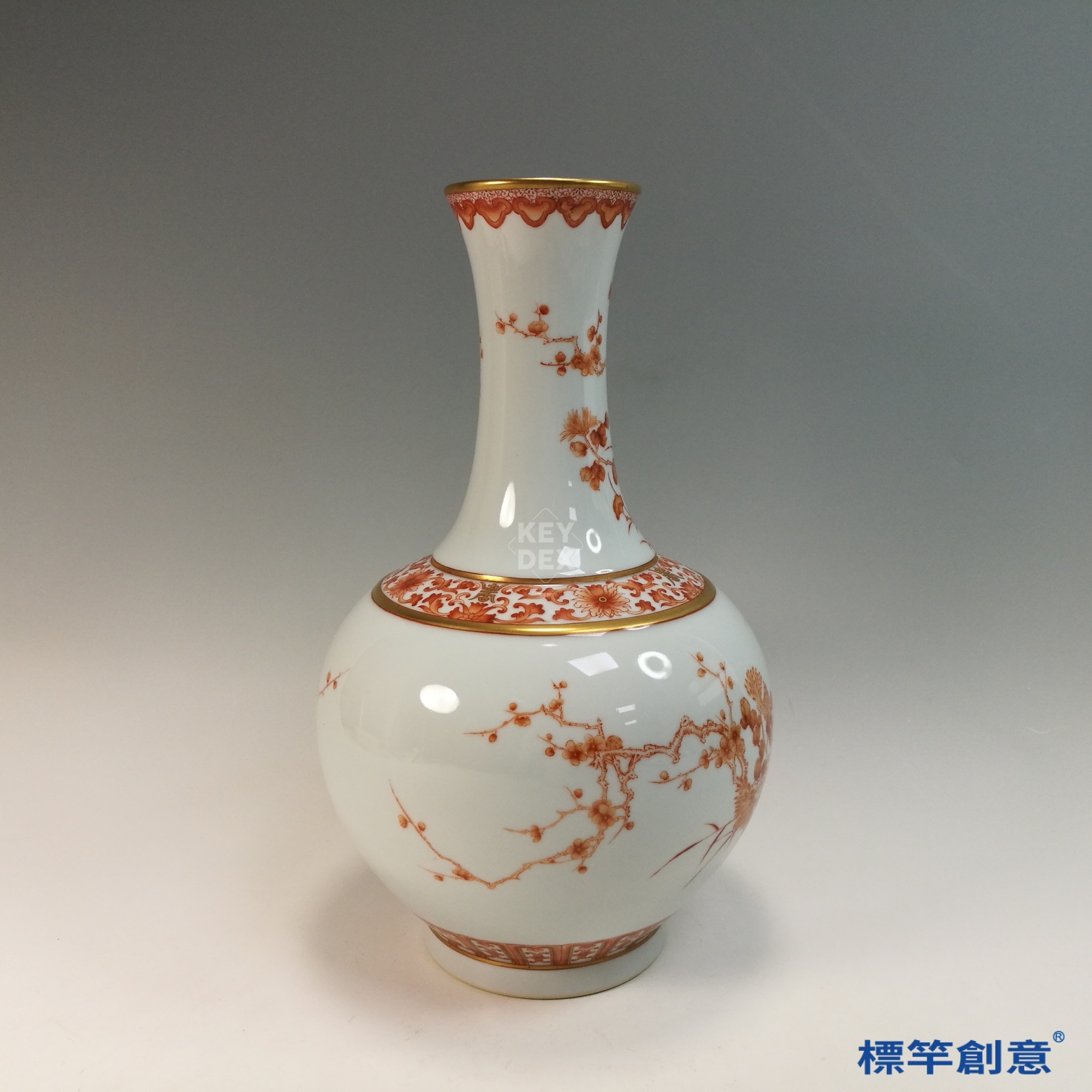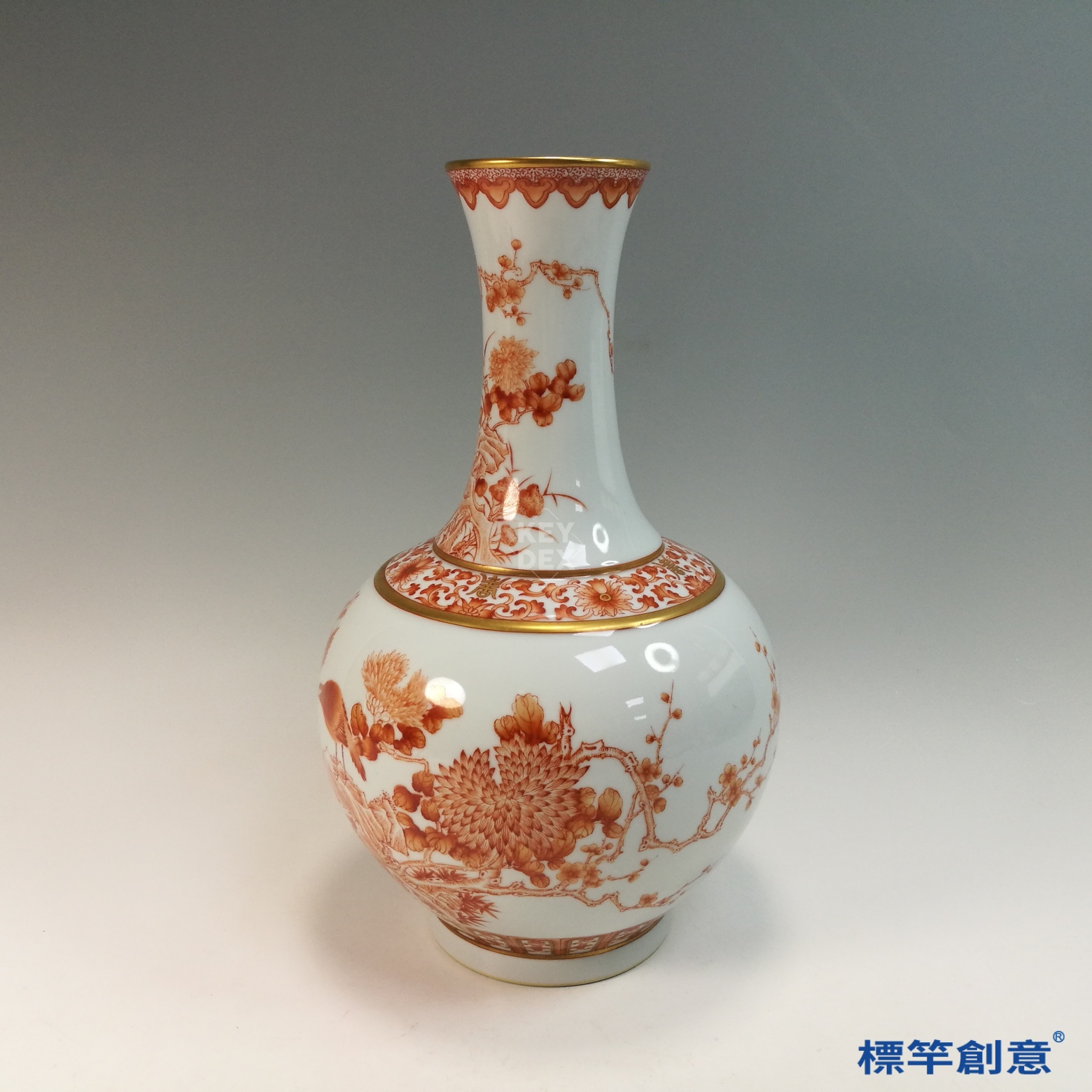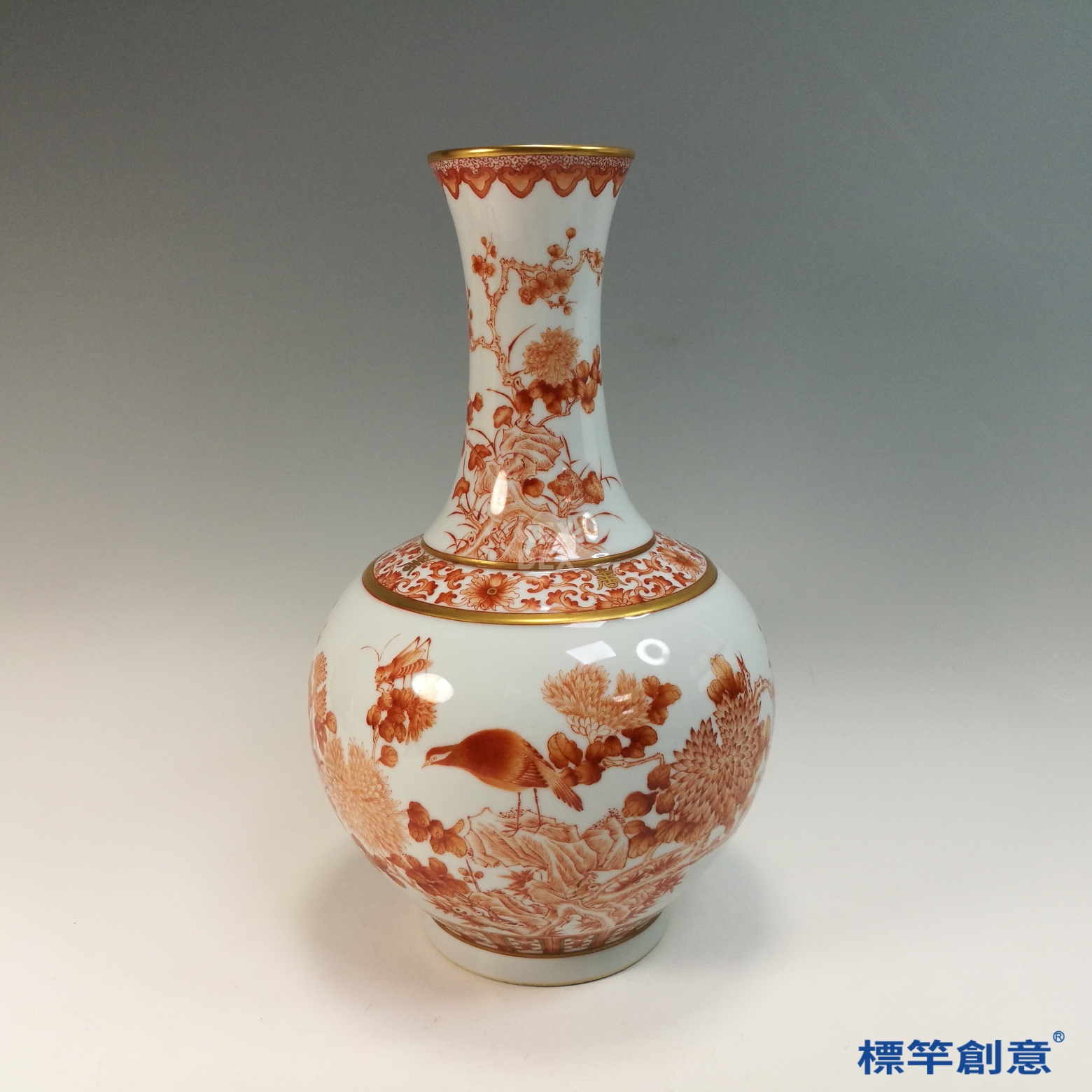 IA088 清宣統官窯礬紅彩花鳥描金賞瓶