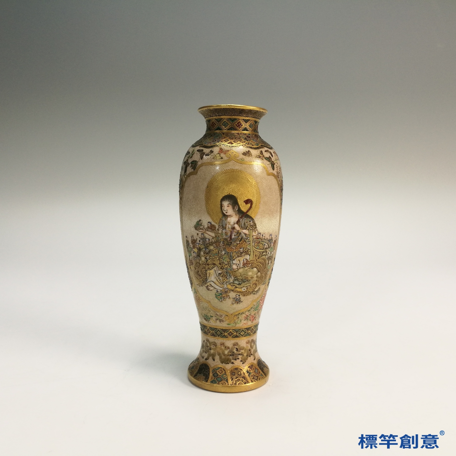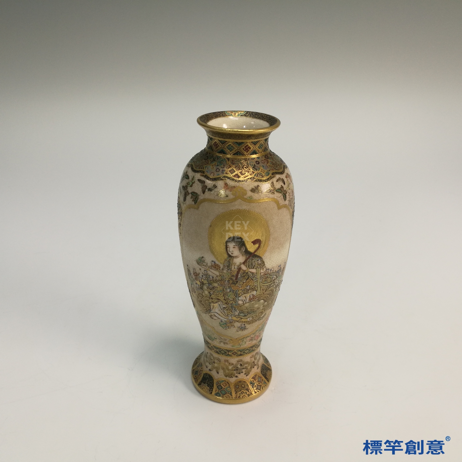 本器結合佛教信仰與民間祈子文化,為明治薩摩燒藝術之代表。其金彩繪工與人物表情刻畫精細,體現東西交流時期的審美融合,具收藏與研究價值。